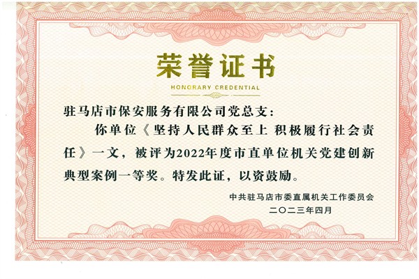 4月25日上午10時(shí),在駐馬店市直工委組織的“2023 年駐馬店市機(jī)關(guān)黨的工作會(huì)議暨2022年度駐馬店市直單位模范機(jī)關(guān)創(chuàng)建工作表彰會(huì)”上,駐馬店市保安服務(wù)有限公司兩次走上領(lǐng)獎(jiǎng)臺(tái)接受表彰。