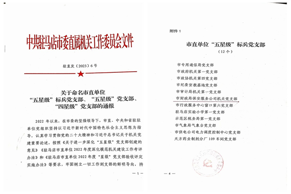 公司機(jī)關(guān)黨支部被市直工委表彰為“五星級(jí)”標(biāo)兵黨支部。此次首批表彰的“五星級(jí)”標(biāo)兵黨支部是從735個(gè)被命名“五星級(jí)”“四星級(jí)”黨支部中表彰的12個(gè)“五星級(jí)”標(biāo)兵黨支部。截止目前,公司黨總支所屬5個(gè)黨支部中機(jī)關(guān)黨支部被市直工委表彰為“五星級(jí)”標(biāo)兵黨支部,人防分公司黨支部、技防分公司黨支部、押運(yùn)分公司黨支部表彰為“五星級(jí)”黨支部,華瑞公司黨支部表彰為“四星級(jí)”黨支部。
