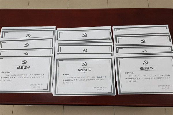 線下線上“落地生根”。公司黨總支向每名黨員發(fā)放《條例》《新舊紀(jì)律處分條例對比》等學(xué)習(xí)資料100余本,組織全體黨員采取新舊條例對照、新增內(nèi)容重點(diǎn)解讀等方式開展學(xué)習(xí),在公司上下掀起了學(xué)習(xí)熱潮。公司黨總支組織全體黨員參加河南黨員教育“云課堂”,6月14日—25日,組織黨員在河南黨員教育信息化平臺上參加全省黨員黨紀(jì)學(xué)習(xí)教育專題網(wǎng)絡(luò)培訓(xùn)班,開展線上學(xué)習(xí)活動。通過參加專題網(wǎng)絡(luò)培訓(xùn),廣大黨員自覺認(rèn)真學(xué)習(xí)修訂后的《條例》,做到學(xué)紀(jì)、知紀(jì)、明紀(jì)、守紀(jì),把遵規(guī)守紀(jì)刻印在心,進(jìn)一步強(qiáng)化紀(jì)律意識、加強(qiáng)自我約束、提高免疫能力,不斷增強(qiáng)政治定力、紀(jì)律定力、道德定力、抵腐定力,始終做到忠誠干凈擔(dān)當(dāng)。全體黨員都拿到了“結(jié)業(yè)證書”。